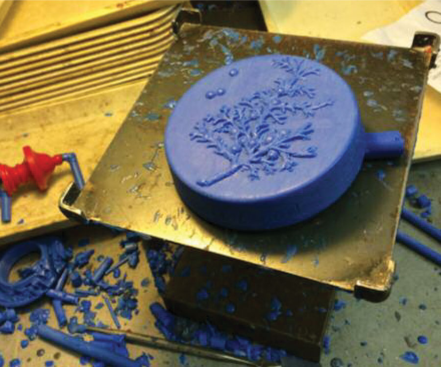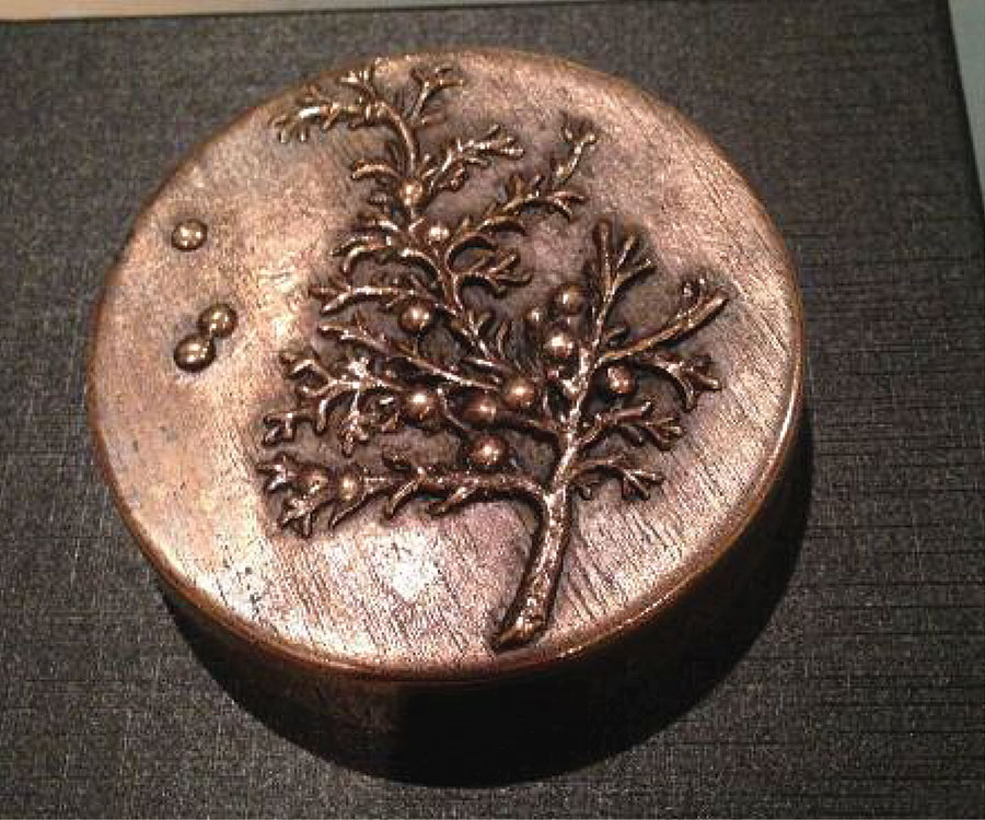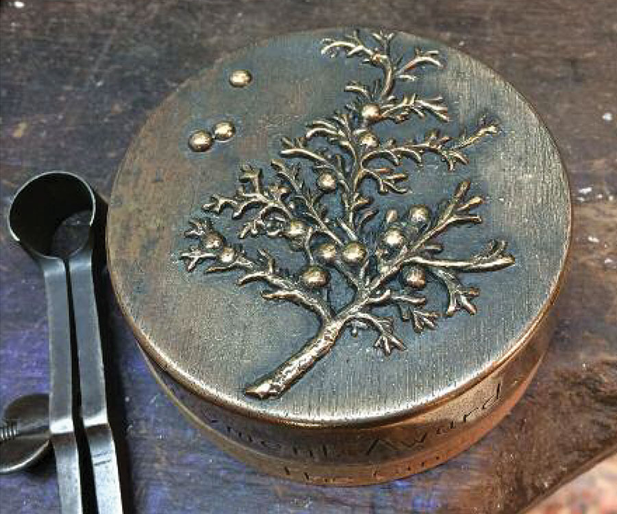 A juniper sprig was modelled in wax onto the wooden form, after which a mould was taken and a full wax version produced. Using the traditional lost wax process, the wax pattern was invested in plaster, burnt out, and replaced with molten bronze. The result was the award cast in solid bronze.