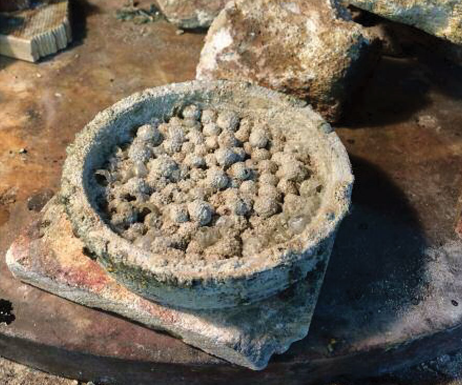 The bronze is then meticulously finished by hand. Sprues – the feeder channels used in casting – were removed, and the inscription and decorative elements were chased using fine steel chisels.